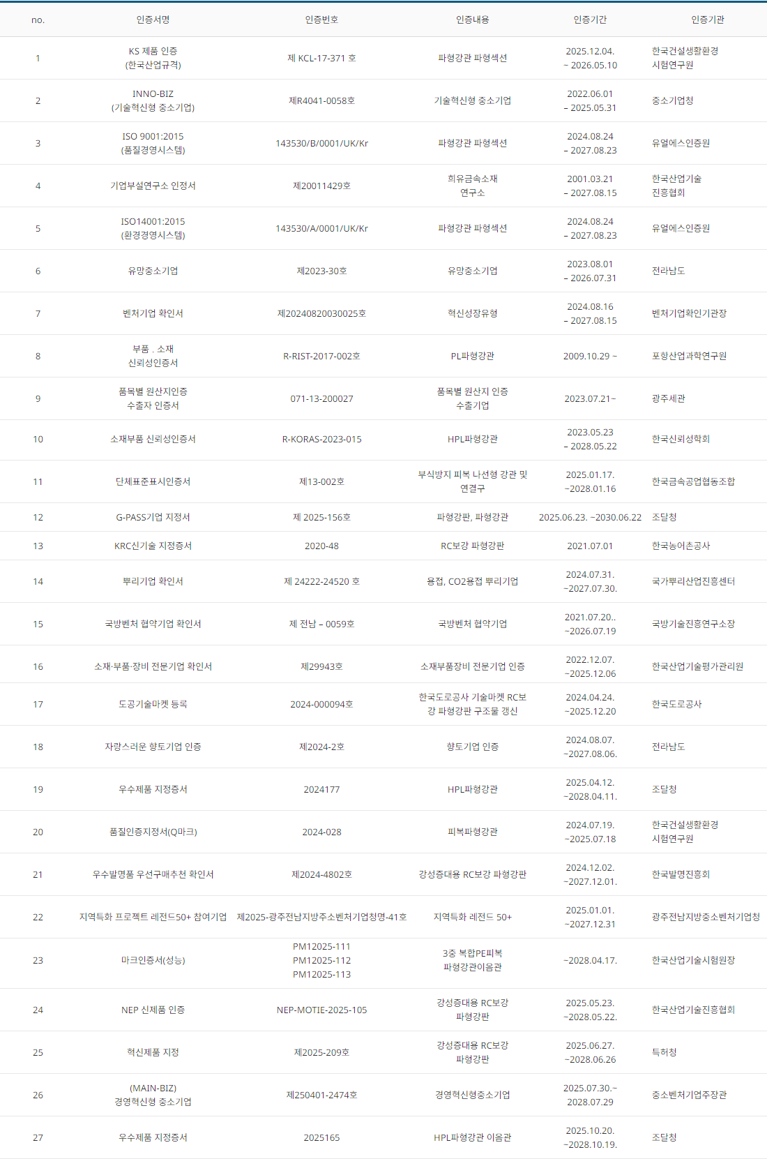 | 27 | 우수제품 지정증서 | 2025165 | HPL파형강관 이음관 | 2025.10.20. ~2028.10.19. |